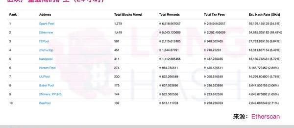 隨著網絡發展,無論PoW還是PoS,節點運營商都需要越來越強大的計算機來正常運行網絡,這也意味著相關成本會更加昂貴,最終走向寡頭格局。這一現象在PoW機制公鏈上尤為明顯,以比特大陸、魚池為代表的大廠商在挖礦產業的布局已經形成頭部效應。下圖是etherscan.io上的以太坊礦工數據,排名前四的礦商合計算力超過60%。