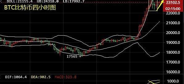 日線比特幣在連續性的大漲之后漸漸進入調整階段,BOLL呈開口狀態,上行空間隨著行情的調整愈發向上。日線技術形態背離還未得到有效修復,比特幣創歷史新高之后,上方暫無參考阻力位,短期的話可關注隔日高位23819美元一帶,若繼續向上突破的話,談老師認為比特幣的下一個目標就是25000美元,乃至3萬整數關口,下方則需重點關注BOLL上軌位置22100美元一帶支撐情況。