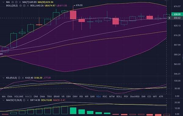 4小時k線下破均線后又反轉站上,MA50和MA20形成二次纏繞,650區間多空存疑。MACD快慢線死叉,跟著大盤的走勢一樣,出現了兩個上升錐形態的k線走勢,動能開始緩慢的增長,日內大概率會反彈到底部的支撐位,然后開始回調至660的上方。