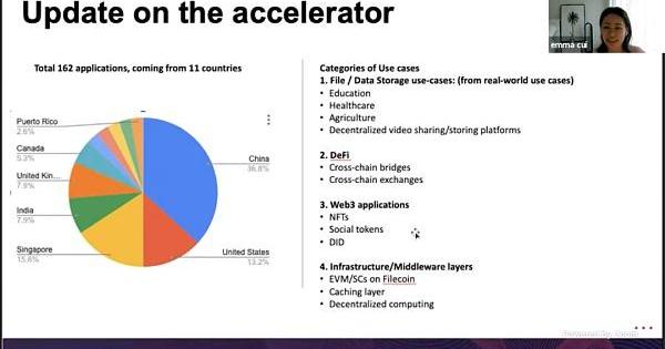 在會議中,LongHash的EmmaCui分享了加速營活動的最新進展:僅僅2個多月的時間,加速營活動活動已經吸納了來自11個國家的162個應用,其中包括教育、醫療以及農業相關的數據存儲應用,還有DeFi、NFTs、DID可信身份等Web3相關應用等等。