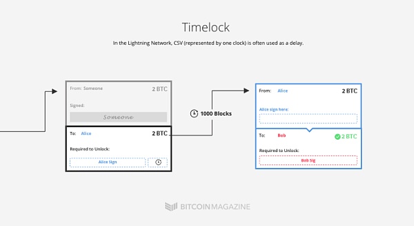 有兩種類型的時間鎖:1)絕對時間鎖,叫做 CheckLockTimeVerify(CLTV);2)相對時間鎖,CheckSequenceVerify(CSV)。CLTV 會鎖定比特幣直至未來某個(可以說是)具體的具體:一個具體時間和日期,或者一個具體的區塊高度;而 CSV 只會使用相對時間。當一個 CVS 輸出上鏈之后,就要等待一定數量的區塊后,這筆輸出才能花用。
