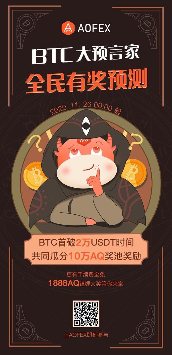 同時,AOFEX為了回饋用戶長期以來的支持,AOFEX現舉辦“BTC破2萬大預言家”活動,全民有獎競猜瓜分10萬AQ獎勵,更有王者預言家手續費全免、最高1888AQ錦鯉大獎等你來拿,歡迎所有用戶對BTC行情發表自己的看法!活動期間,用戶根據市場行情預測BTC首次到達2萬USDT的時間,填寫相關信息至麥客表單,預測準確度至小時的用戶即可瓜分10萬AQ獎勵。此外,根據AOFEX交易所BTC/USDT的K線時間,在活動期間用戶預測BTC首次到達2萬USDT的時間最高精準至五分鐘線,預測精準度越接近真實時間,除瓜分10萬AQ獎勵,還可額外獲得“全免手續費”、“最高1888AQ錦鯉大獎”。