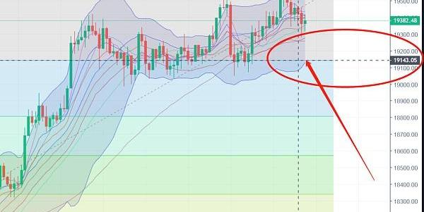 在圖中所示可以識別看出,下方支撐位置是在布林帶下軌19145位置;