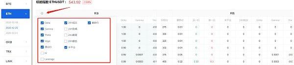 1.官網首頁點擊進入期權T型報價,在左側快速選擇欄中選擇ETH,行權日為12.31的月期權,并在期權指標設置中點擊顯示Delta及IV。