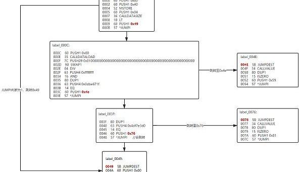 JUMPDEST指令在該上下文中表示跳轉回來,也就是label_0000處0x49的跳轉。之后的兩條指令PUSH1和DUP1總體意思為將0壓入棧頂并復制,沒有實際意義。REVERT指令則表示并未有函數簽名匹配,從而停止執行,回滾狀態。