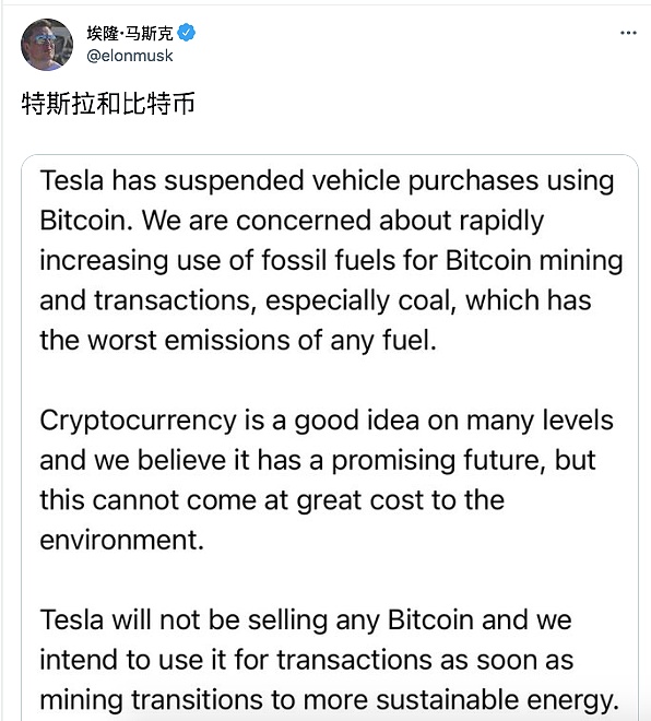 當馬斯克又一次談及比特幣時,加密資產市場已經時過境遷。早前的5月13日,特斯拉宣布暫停接受比特幣支付,馬斯克在推特表示,「我們對比特幣挖礦和交易中使用化石燃料的迅速增加感到擔憂。」