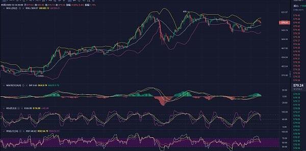 1900/1/1 0:00:00上午說的重點關注上軌壓力線,現在幣價一直在上軌下方588附近徘徊,附圖可見,上漲趨勢明顯受到阻力,表明多投力量逐漸削弱,而空投力量則開始會聚,是一種預示價格下跌的信號.