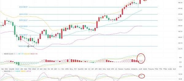 今天我們從1小時級別圖來看,目前幣價處于在斐波納契黃金線23.6%上方徘徊,再從4小時級別圖看到MACD快慢線形成平行向上狀態,KDJ即將粘合向上到超賣區84軸之間徘徊。因此,我們的思路要以低位多單為主。