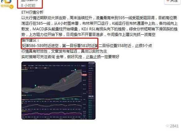 金帝?今日下午1點發布ETH策略反彈586-589附近進空,第一目標看581附近