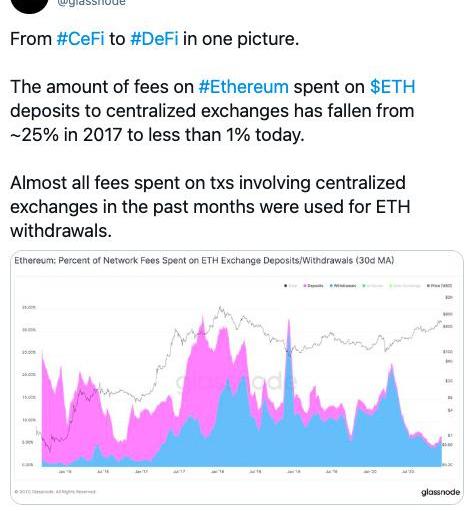 Glassnode分析師發現,用于中心化交易所存款的以太坊費用占比從三年前的25%下降到1%。他們表示,“一張圖顯示從CeFi到DeFi的變化。以太坊上向中心化交易所支付ETH存款費用的占比從2017年的約25%下降到今天的不到1%。過去幾個月里,幾乎所有涉及中心化交易所的TXS費用都被用于ETH提款。”