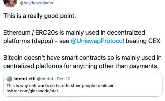 Uniswap創始人HaydenAdams承認這一點,并說這是一個合乎邏輯的推測。他說,“這是一個很好的觀點。以太坊/ERC20主要用于去中心化平臺,Uniswap正在超越中心化交易所。比特幣沒有智能合約,因此主要用于中心化平臺,用于支付以外的其他功能。”