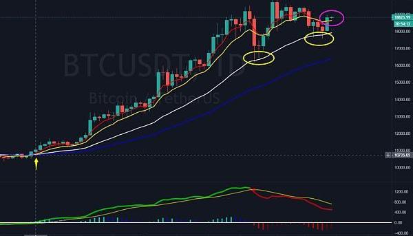 XRP/HKD-3.85%昨晚雙底確認之后,逍遙在策略里提示了可以適當買入的信號,后市也走出了一波小反彈。把握大盤調整過程中的短線機會。昨天比特幣在多重利好的催化下拉了回來,當前價格又重回30日均線上方。在4小時級別上,于17570附近走出一個雙底形態,目前這個位置正瀕臨壓力位1900,短期行情正式反轉以突破此線為準。結合場短期級別的形態以及消息面推動,市場延續反彈的概率較大,日線收線后繼續30日均線不破,有望在此次重新蓄力試探沖擊前高。