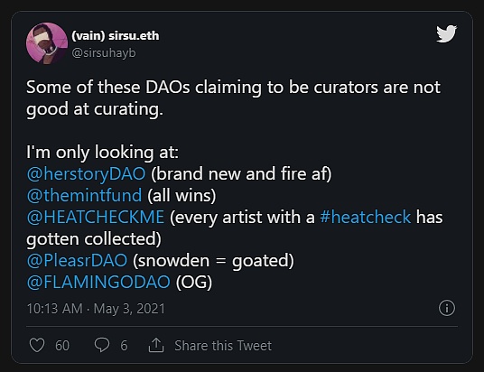 PleasrDAO、SongCamp、SquiggleDAO、Gremlins和CypherDAO都開始聚集在一起。雖然大多數微型經濟體不會有500萬美元這樣的資金來購買愛德華.斯諾登的第一個NFT,但當它們共享資源以追求實現某個任務時,它所展現的力量是讓人振奮的。