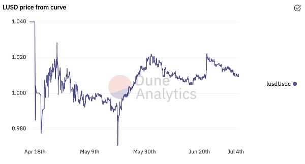 可以看出,雖然Liquity上線尚不足3個月,且ETH在這期間內價格下跌最多超過50%并有單日下跌超過40%的情形,但是LUSD的價格波動一直保持在0.97~1.03,并且絕大部分時間在0.99~1.02之間,這顯示了LUSD的穩定性。