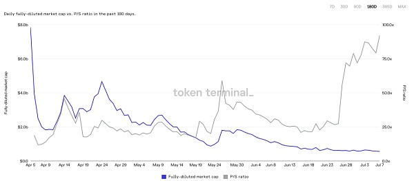 Liquity的協議收入全部由LQTY代幣捕獲,所以其P/S(全流通市值/年化協議收入)?和?P/E(全流通市值/年化協議利潤)?其實是一致的。自上線以來,LQTY的代幣全流通市值與P/S的走勢如圖: