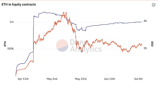 項目上線之后,由于系統精妙的設計,很快就吸引了超過100萬個以太坊,在最高時存款金額超過了40億美元,此后由于ETH本身的價格大幅下跌以及清算,Liquity的存款金額降到20億美元左右。