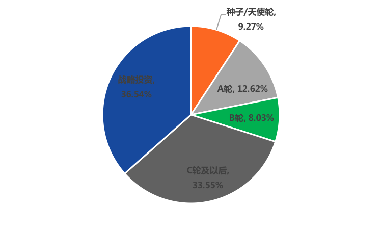 從公開披露的融資金額看,除戰略投資外,C輪融資所獲融資金額最高,其次為A輪,種子/天使輪雖融資數量最多,但由于單筆融資金額較低,融資總額較低,僅占總體融資金額的9.27%。