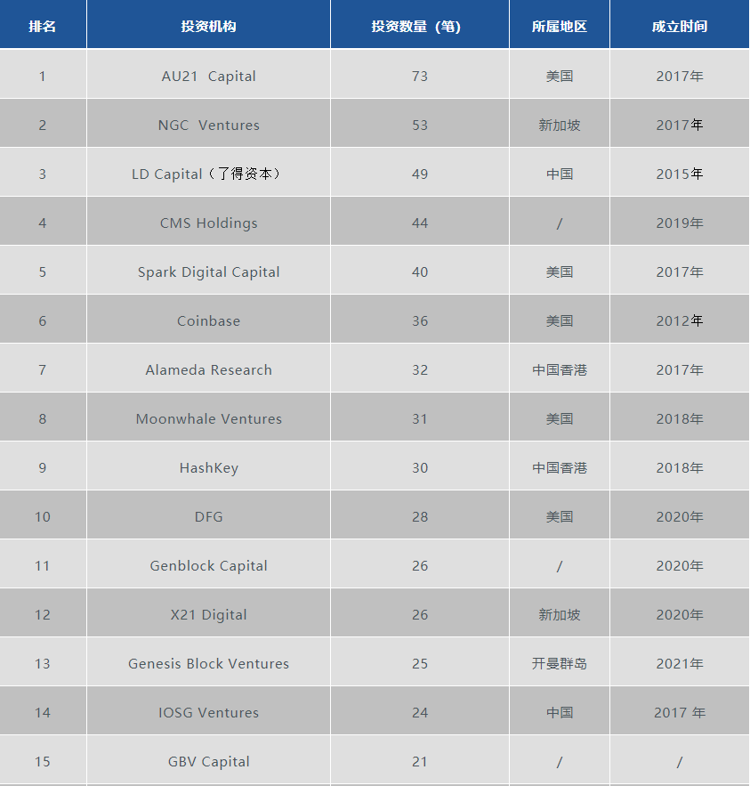 在20家活躍投資機構中,AU21 Capital投資數量最多,進行了73筆投資;NGC Ventures進行了53筆投資,位居第二位;排在第三位的為LD Capital(了得資本),共計投資49筆。