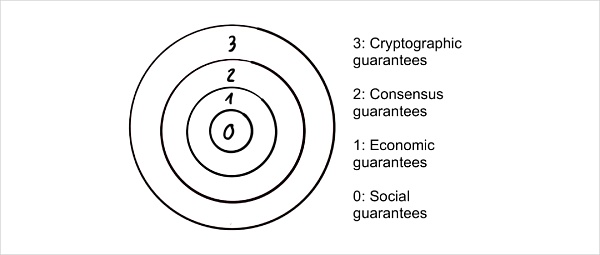 這套價值觀必須被轉化為人際行為的規則(即,協議!)。然后,我們自動執行這些規則,實現不同類型的保證:經濟、共識和密碼學。系統通過約束參與者的行為來增強社會可擴展性,在低信任環境中相互合作、共創財富。