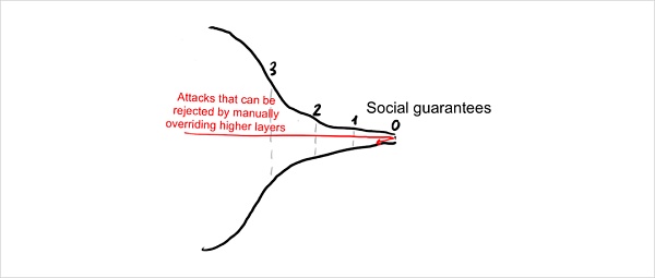 例如,如果密碼學哈希函數被破解,社會層可以(在技術專家的指導下)人為達成共識來替換被破壞的部分: