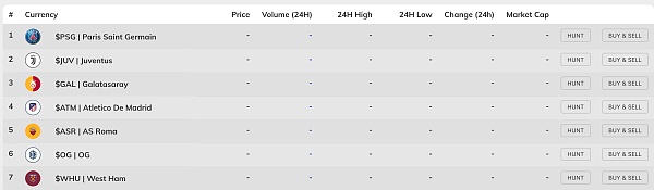 據金色財經查證,除巴塞羅那足球俱樂部,Chiliz平臺目前已經和6家世界著名足球俱樂部合作發行了粉絲代幣。這6家足球俱樂部分別為西甲的尤文圖斯足球俱樂部和羅馬足球俱樂部、法甲的巴黎圣日耳曼足球俱樂部、西甲的馬德里競技足球俱樂部、英超的西漢姆聯足球俱樂部、土耳其加拉塔薩雷體育俱樂部,粉絲代幣分別為$JUV、$ASR、$PSG、$ATM、$WHU和$GAL。