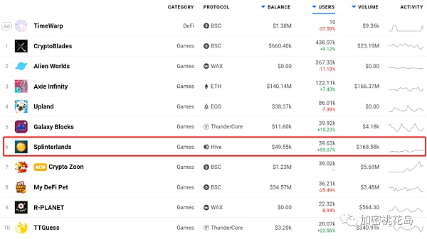 除了用戶總數,活躍用戶數指標不容忽視。下圖為DappRader展示的鏈游在線用戶情況,7日在線用戶數中,分裂之地位列以3.96萬位列第6,且保持高速增長。