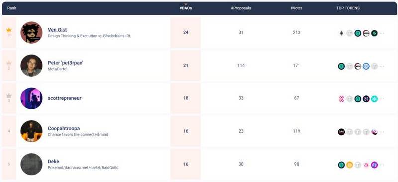 DAO 中投票最為活躍的五位成員,來源:DeepDAO
