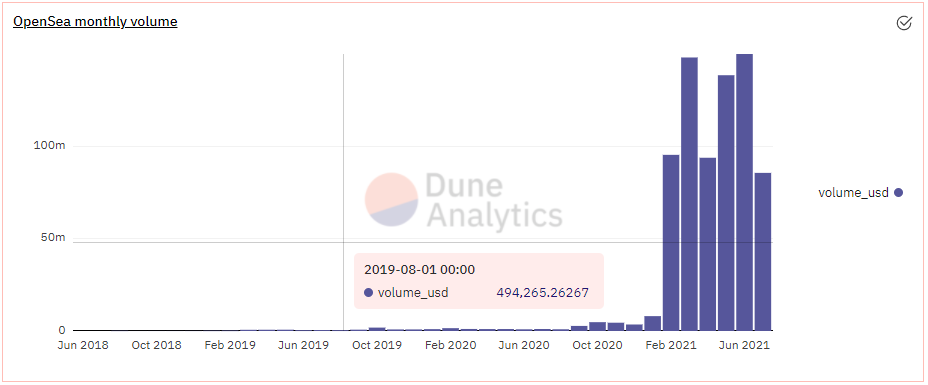 Opensea是全球最大的綜合性NFT交易平臺,涉及的NFT包括藝術、音樂、域名、體育等。同時,Opensea還提供有免gas手續費鑄造、出售NFT的服務,這一點在市場鶴立雞群。根據DuneAnalytics上的數據,2021年2月之前,Opensea上的NFT交易一直不溫不火。來到二月份,NFT市場整體交易量呈現爆炸式增長,Opensea也不例外。整個二月份,Opensea的總交易額相比一月增長了十倍以上,達到了9500萬美元以上,總交易NFT數增長了四倍,達到4萬余件,活躍用戶增長了一倍,為15000余人。隨后,伴隨著NFT市場的火爆,Opensea的熱度也始終保持在較高水平,于5月4日達到了單日交易額2300萬美元的最高紀錄。