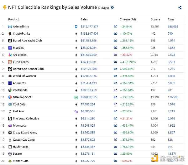 從數據網站cryptoslam.io提供的數據看,當前,近7天NFT收藏品銷量排量行榜的前20中,頭像類NFT項目占據15席。其它非頭像類項目分別是Axie Infinity、Art Blocks、NBA Top Shot 、Sorare、Curio Cards。