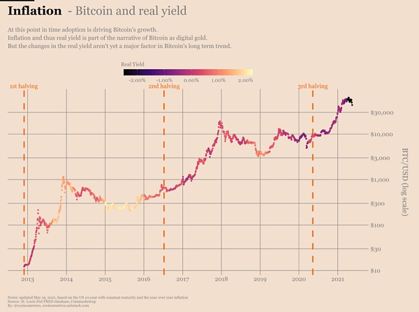 黃金或比特幣等資本保值工具并不會產生利潤。因此,如果用戶能從債券中獲得正的實際回報,那么持有這些資產的資本對用戶來說可能就不那么有吸引力了。但當債券的實際收益率進入負值區間時,轉向其他方式保存資本就變得合理了。