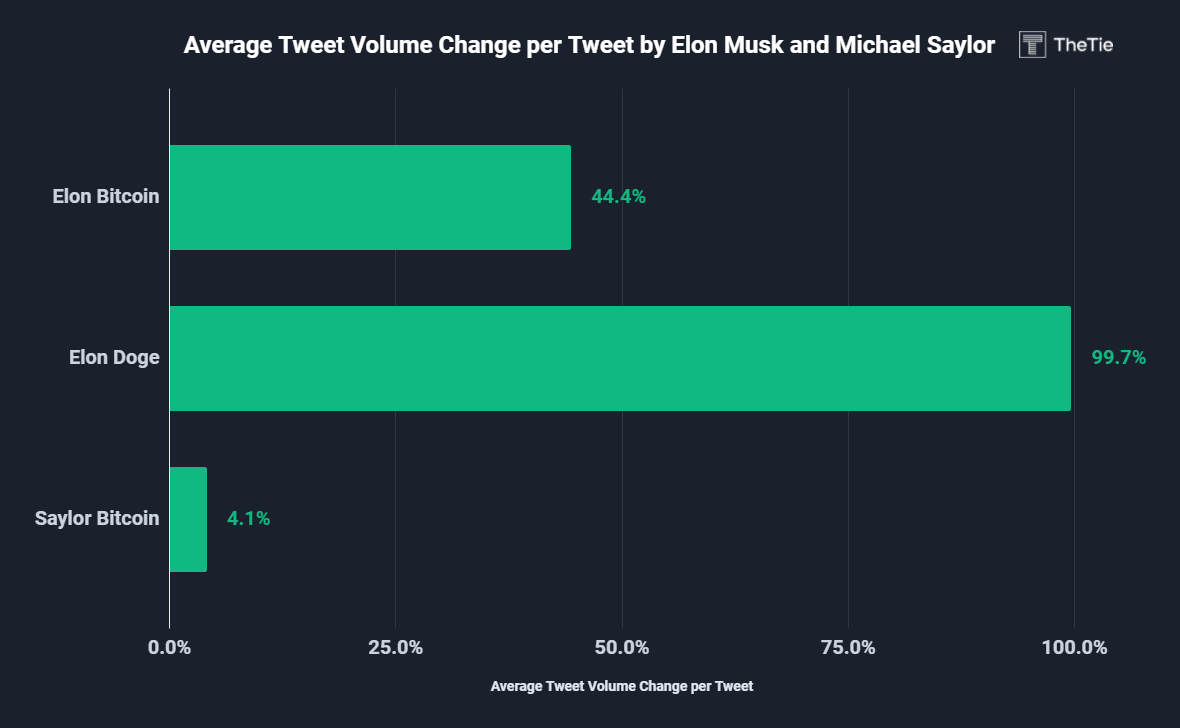 數據告訴我們,馬斯克和Michael Saylor的推文確實影響了比特幣和狗狗幣。他們的推文在推特上引發了社會對話,并導致更多關于這兩種資產的推文出現。此外,它們甚至似乎通常會影響投資者情緒。