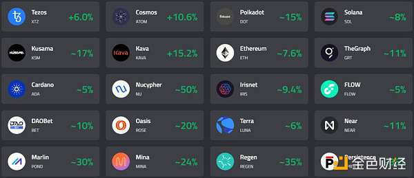 生態的建立程度,我們選用質押代幣所能參與的生態圈作為對比,下表是目前各平臺質押代幣,所能參與生態的信息統計: