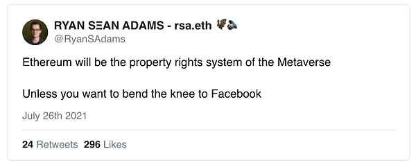 “以太坊將成為元宇宙的產權系統,除非你想向Facebook 屈膝。”