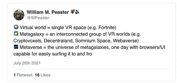 元星系(metagalaxie) = 一組相互關聯的VR 世界(例如 Cryptovoxels、Decentraland、Somnium Space、Webaverse)