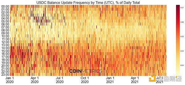 相比之下,USDC的活動往往遵循美國市場時間,盡管它的分布稍微更加分散。大多數日常活動往往在UTC14:00到22:00之間(美國股市在UTC 14:30開盤并在UTC21:00 收盤)。?