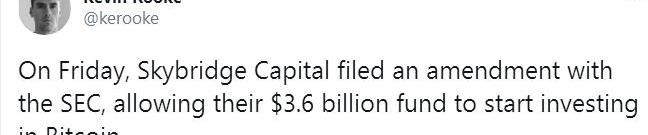 今天上午,加密研究員KevinRooke發推文稱,美國知名對沖基金公司天橋資本在11月13日向SEC提交了一份修正案,請求允許其36億美元的基金開始投資比特幣。天橋資本創始人AnthonyScaramucci為前美國白宮通訊聯絡主任,曾多次公開表示看好數字資產和區塊鏈。