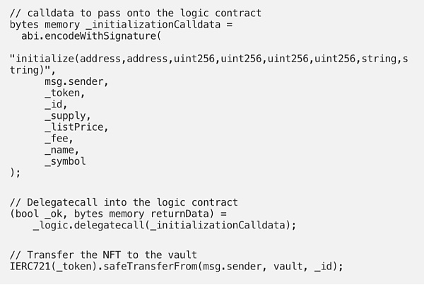 在金庫工廠的初始化期間,ERC721TokenVault會創建一個合約,并在每個金庫的初始化中重用其邏輯,以節省gas和存儲空間。每個金庫都有自己的合約,但邏輯只存在于一個地方。該函數用它的參數對初始化函數簽名進行編碼,然后將調用數據傳遞給代理,該代理把delegatecall傳遞給預先創建的代幣金庫合約。ERC721TokenVault#initialize初始化分割ERC-20代幣,給管理員創建總供應,并設置總底價(標價x供應)。在金庫初始化之后,它將NFT從所有者處轉移到金庫。
