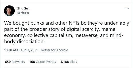 所以下次當你問自己為什么人們愿意把數百萬美元投入NFT時,記住這一點:虛擬世界和現實之間的界限越來越模糊,其背后可能有一系列身份、文化和社區提供了無形的社會價值。三箭資本的聯合創始人蘇朱對這篇論文進行了精彩的總結: