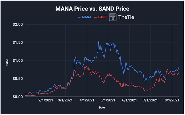 我們可以看到,MANA和SAND的價格和交易量都與MANA早期的價格和交易量密切相關。然而,最近SAND的交易量激增,同時也縮小了MANA與自身的價格差距。