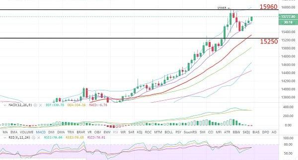 一小時級別,布林帶開口向上,上午行情有小幅度的回調,但是迅速反彈回升。目前屬于高位震蕩狀態,后續內或許還有一次回調緩沖,下方重點關注15200-15300一線附近的支撐位;而上方最高點15985一線未突破之前,還是可以當做目前的壓制位。操作上建議以回調做多為主,反彈做空為輔,注意控制風險。