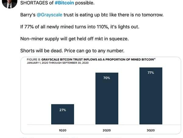 Grayscale大量購買比特幣吸引了宏觀投資者DanTapiero的注意。他在Twitter上評論說GrayscaleTrust正在吃BTC。該公司的購買份額和開采的比特幣數量所占比例已從第一季度的27個變化。%在第三季度增加到77%。