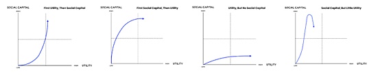撇開娛樂不談,Eugene Wei談到了社交網絡遵循的5條曲線,其中4條是隨著時間的推移,社交資本和效用之間的權衡: