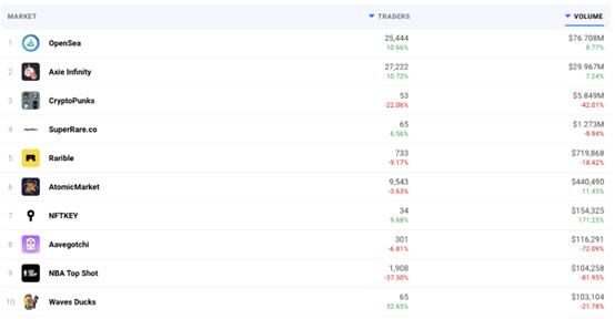 根據DappRadar的數據,在過去的30天里,排名前十的NFT市場的交易額達到了18.6億美元。