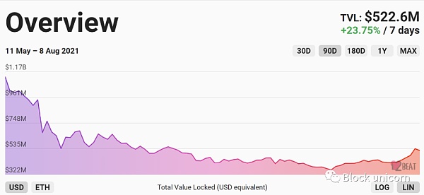 在Uniswap的ETH/FEI鎖定了價值3.7億美元,24小時成交量2774萬美元,創造了83239美元的手續費收入。