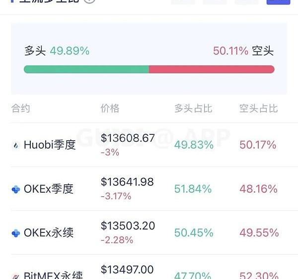 24小時內主流多空比,多方合約占比49.89%,空方合約占比50.11%,其中huobi季度及BITMEX永續合約平臺空方占優,其他兩大平臺多方占優。