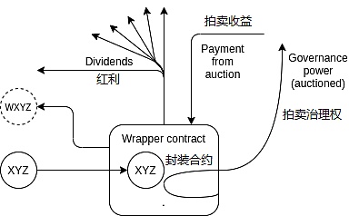 一旦蓄意破壞系統的攻擊者介入,問題就會變得更糟。代幣投票的根本漏洞很好理解。協議中具有代幣投票機制的代幣,是兩種權利捆綁在一起組合成單一資產的代幣:(i) 協議收入中的某種經濟利益;(ii) 參與治理的權利。這種組合是故意的:目的是使權利和責任保持一致。但實際上,這兩種權利很容易相互分離。想象一個簡單的封裝合約,它有這些規則:如果你將 1 XYZ 存入該合約,你將獲得 1 WXYZ。WXYZ 可以在任何時候轉換成 XYZ,此外它還可以產生紅利。紅利從何而來?雖然 XYZ 代幣在封裝合約中,但合約能夠在治理中隨意使用它們 (提出提案、對提案進行投票等)。封裝合約每天輕易地拍賣這個權利,并將利潤分配給原始存款人。
