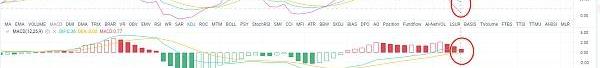 現在我們從1小時級別圖可以看到,目前幣價的壓力位高點在382一線,且可以看到,還是比較強勢的。另外MACD來看,已經從紅柱轉變為綠柱放量。KDJ也是三線下拐。因此,今天我們的思路要以反彈后高位空單為主