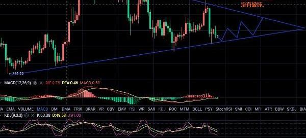 由于最近大盤走弱,加上以太坊追隨大餅趨勢,價格明顯有點反彈無力的跡象。從4小時圖來看,幣價位于MA5日均線的位置,明顯的已經進入到了三角震蕩尾期的節奏,附圖指標所示,MACD綠色動能開始縮量,KDJ三線拐頭向上,價格處于超賣的區域,下方支撐依舊存在。短期內價格有反彈的跡象,上方390是個比較強力的壓制。