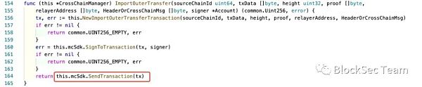 Ontology Relayer 在構造了 Poly Chain 上的交易后便向 Poly Chain 發起 RPC 請求發送交易(第 164 行,函數調用 SendTransaction);