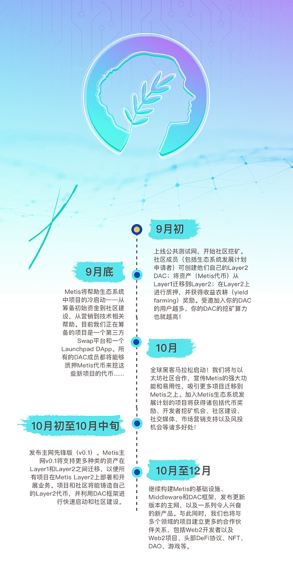 Metis生態的重要節點主要集中在下半年,根據Metis的路線規劃,在兩次測試網測試結束后,將在今年的9月上線主網,這意味著Metis系統將上線大部分的功能,同樣也意味著Metis的Layer2生態的全面起航。